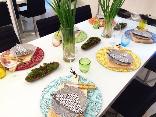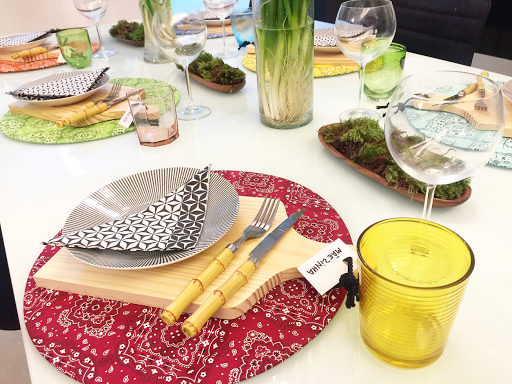 Escolhi fazer uma mesa colorida, usando tecido estampado de bandanas para descontrair, tabuas fe madeira como apoio, pratos geométricos e guardanapos de papel super charmosos.